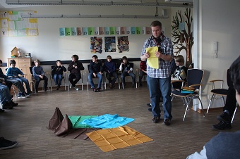Zum Einstieg wurde ein Teil der Geschichte des kleinen Königs/des vierten Königs erzählt. Untermalt mit einer Landschaft, dargestellt mit farbigen Tüchern, und einer Figur des kleinen Königs konnte jeder den langen Reiseweg des Königs von dem fernen Russland nach Jerusalem gut nachvollziehen.